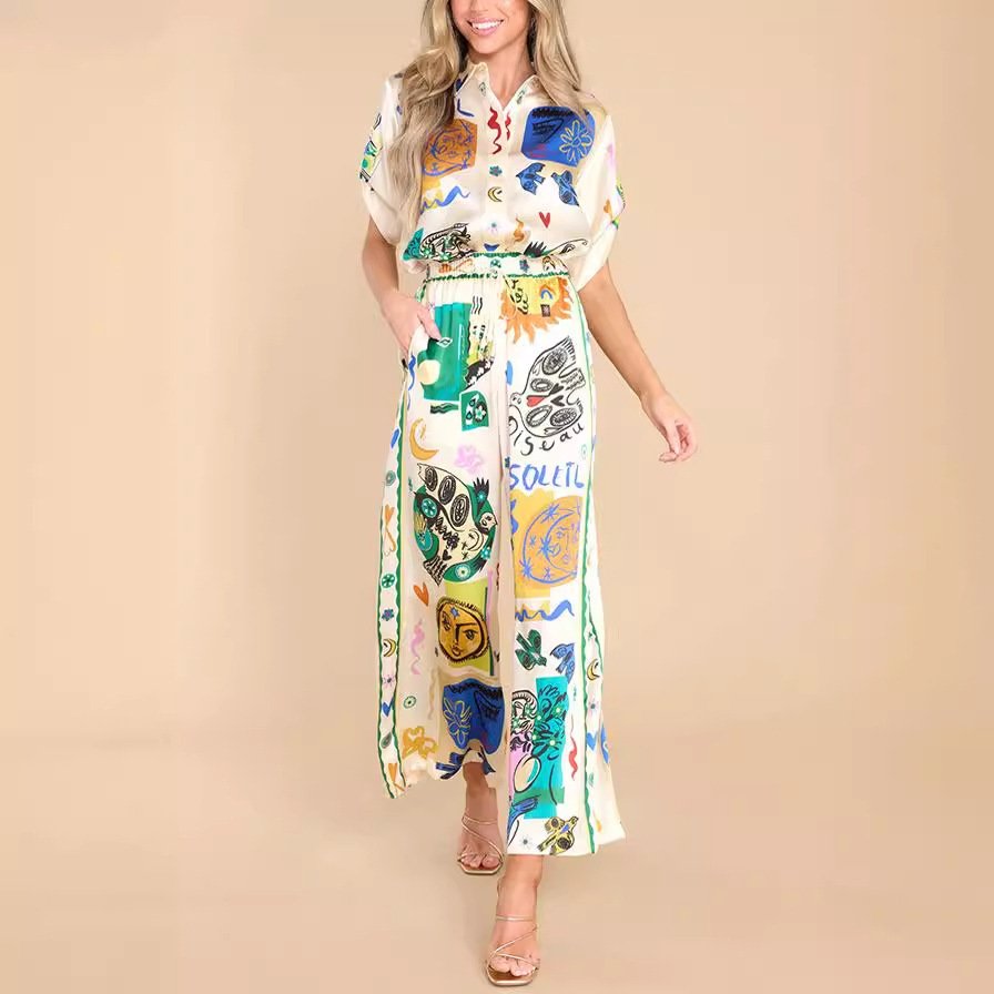 Graffiti Printing Satin Short Sleeve Lapel Shirt Trousers Casual Two-piece Suit
