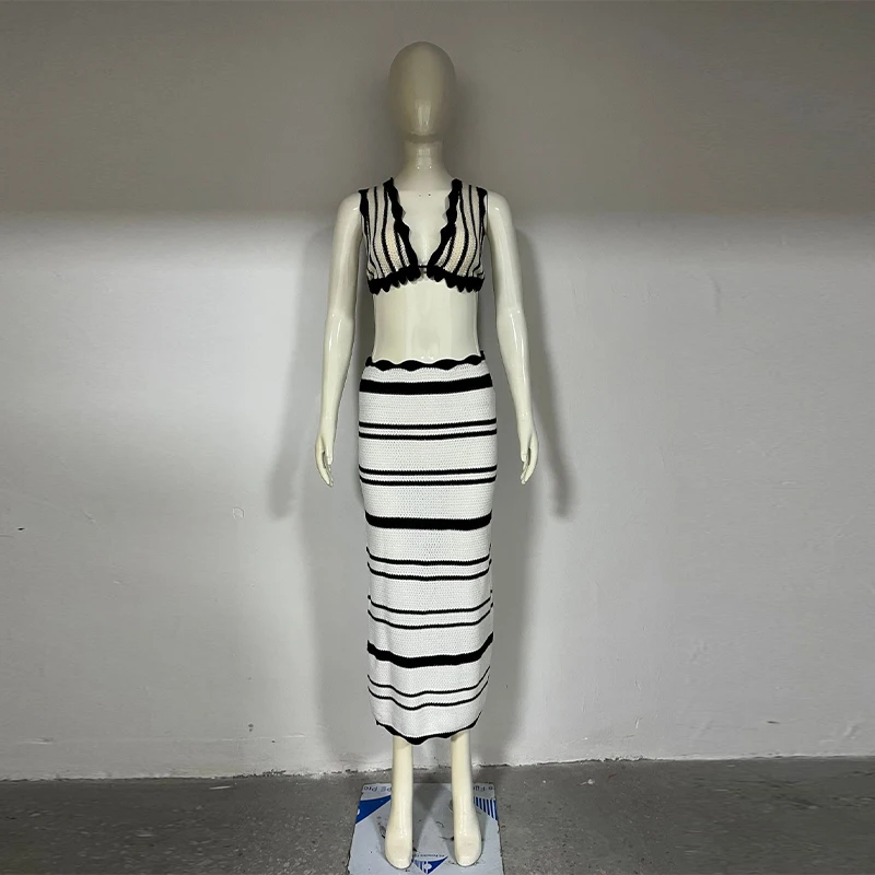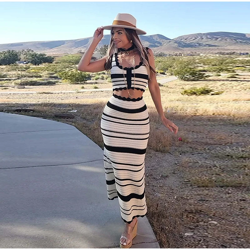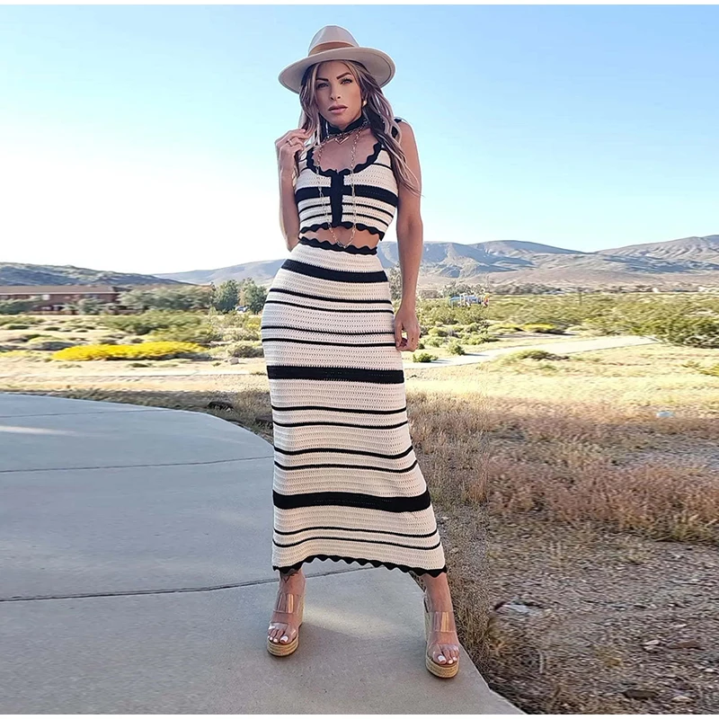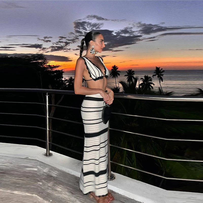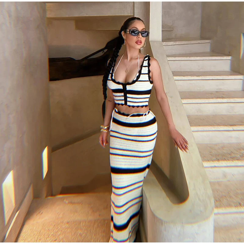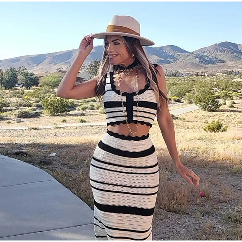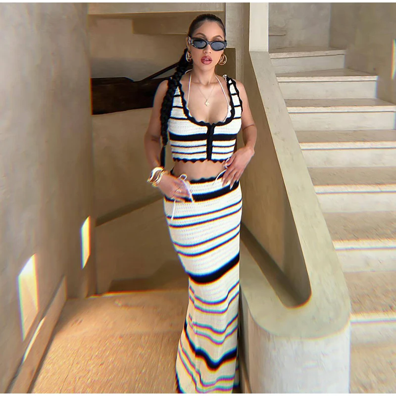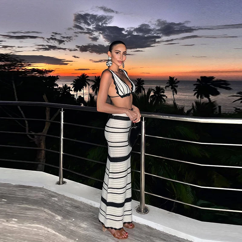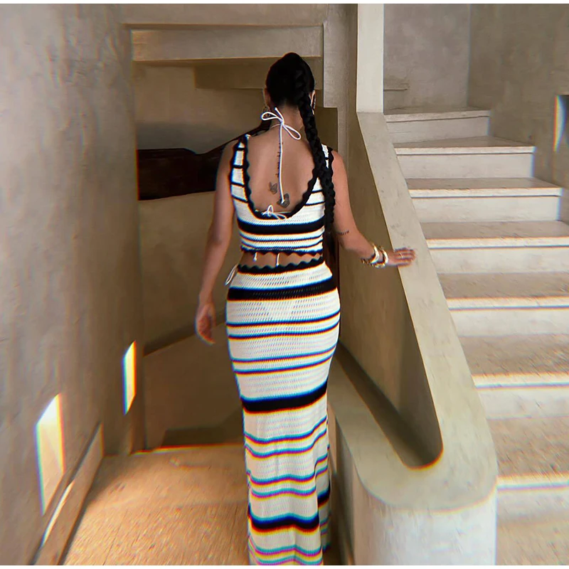 Knitted Striped Beach Skirt Sets Women 2024 Summer Backless Slip Top High Waist Skirt Two Piece Suit Bohemian Holiday Outfits