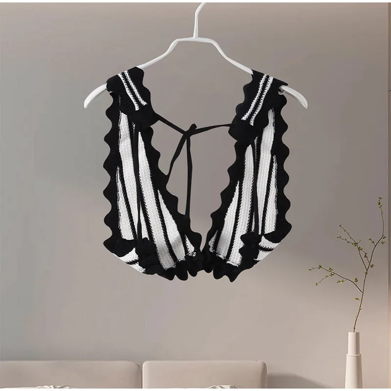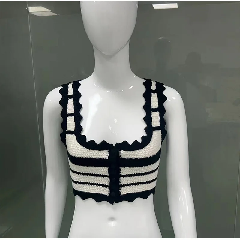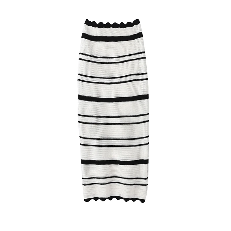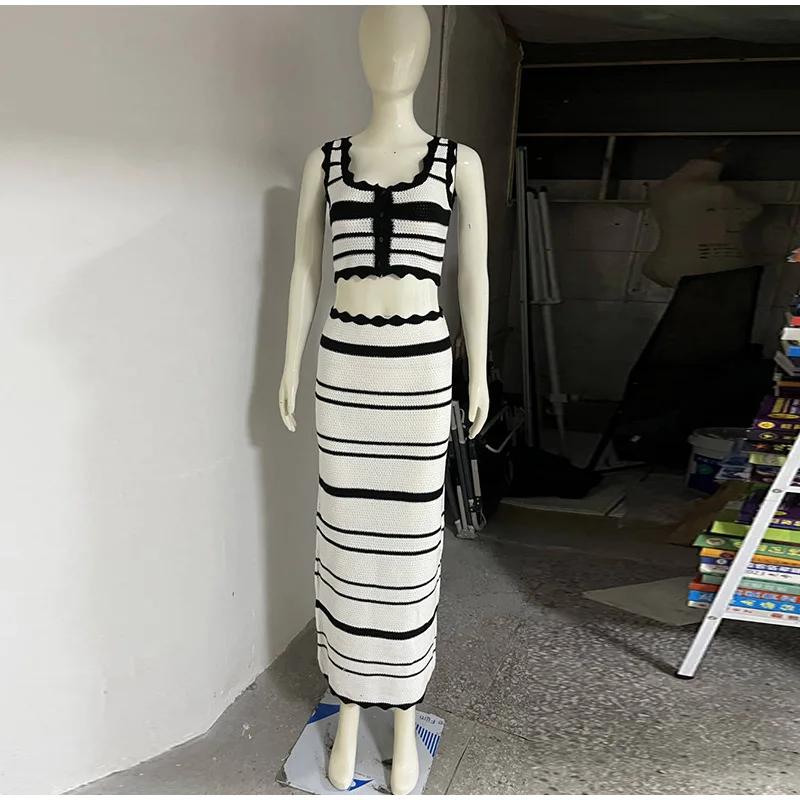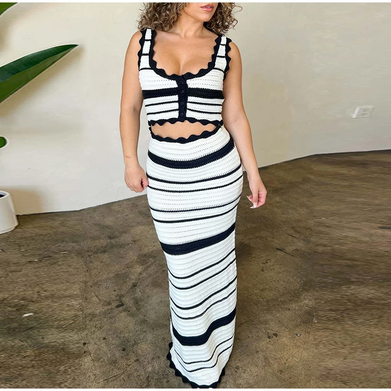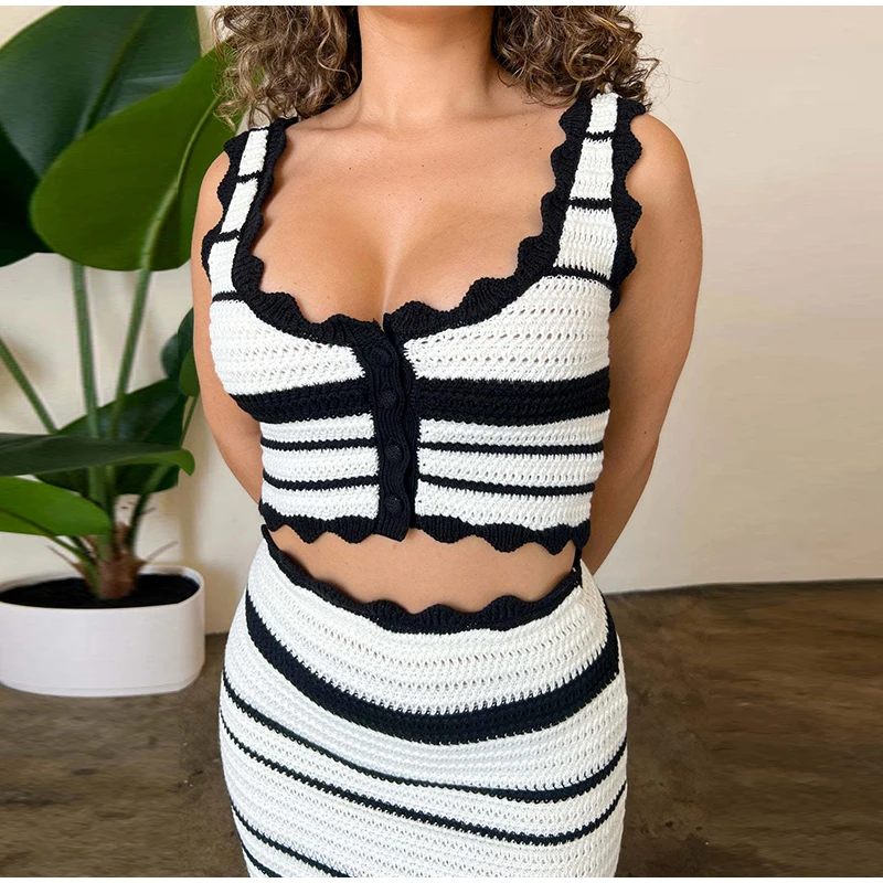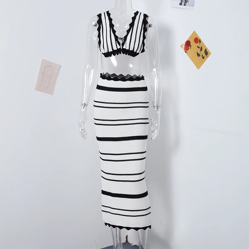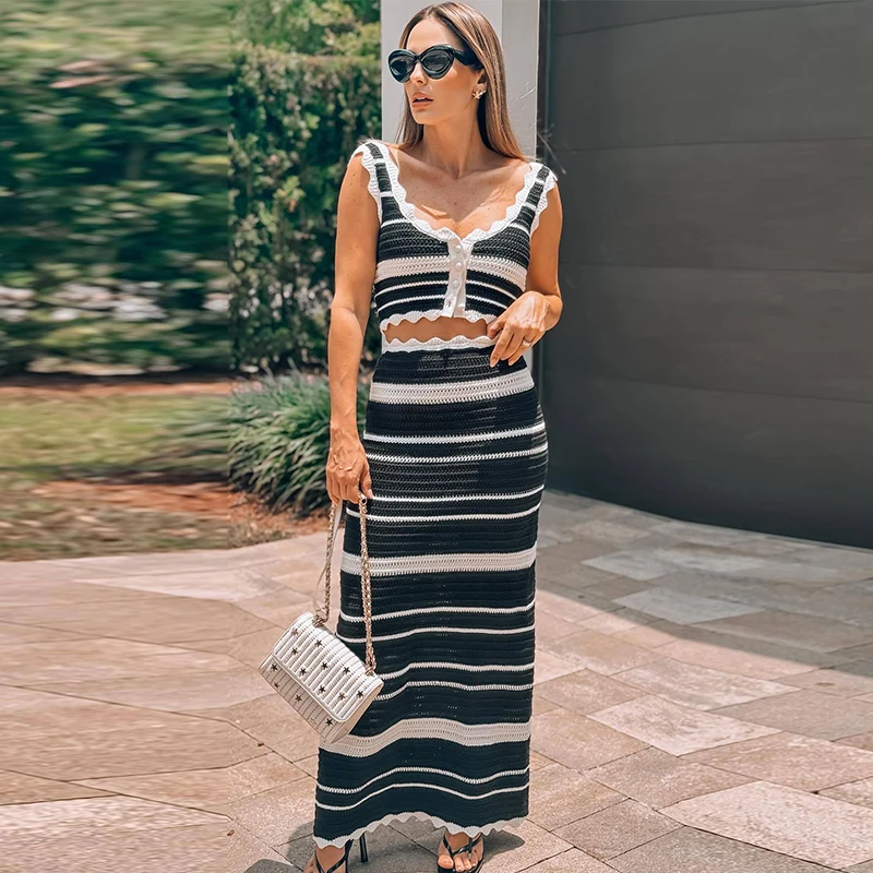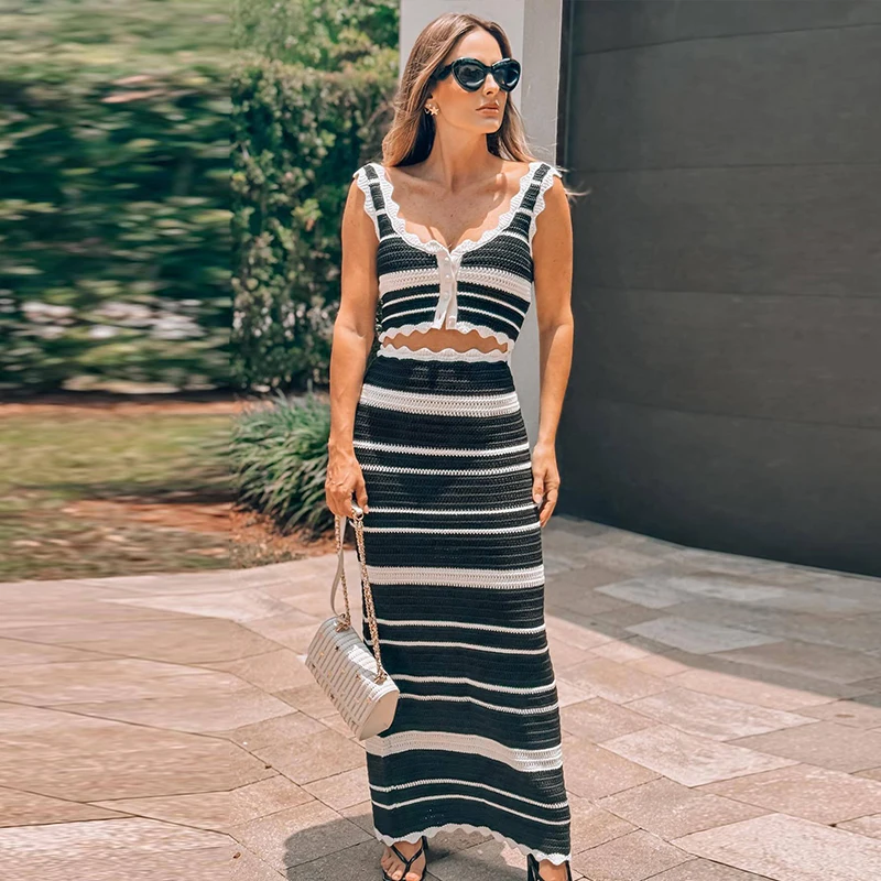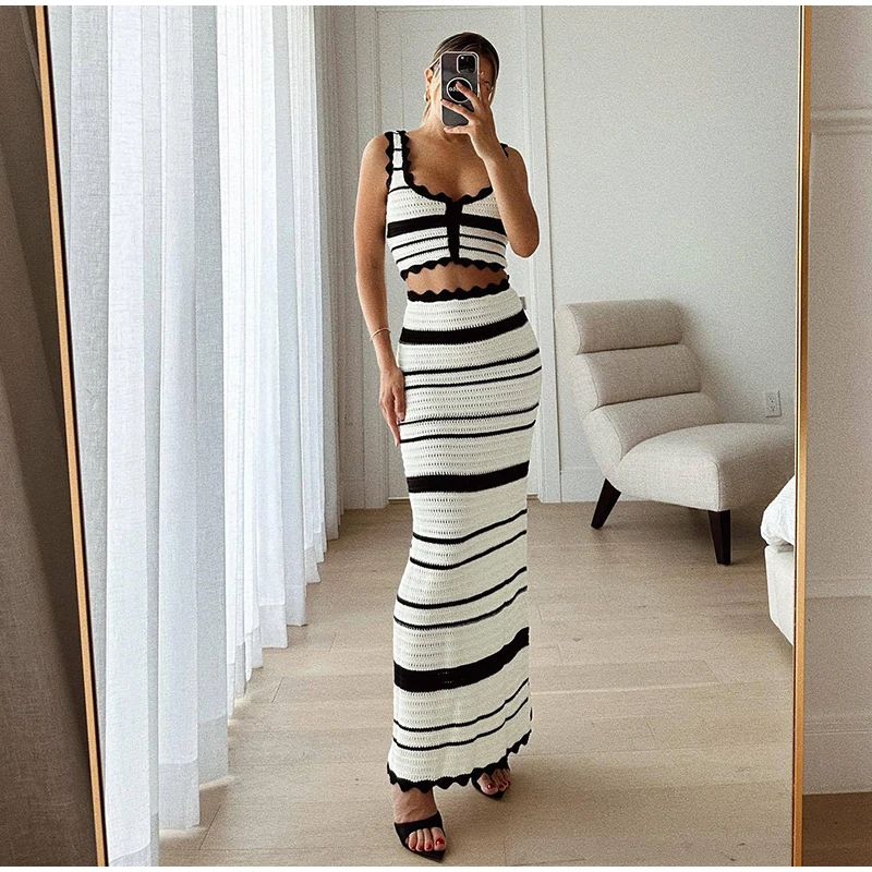 Knitted Striped Beach Skirt Sets Women 2024 Summer Backless Slip Top High Waist Skirt Two Piece Suit Bohemian Holiday Outfits