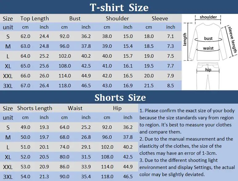 1.Please confirm the exact size of your body because the size standards vary from region to region. It’s best to measure your clothes and compare them. 2.Due to the manual measurement and the elasticity of the clothes, the size of the clothes may have an error of 1-3cm. 3.Due to the different shooting light environment and display Settings,the actual color may be slightly deviated.